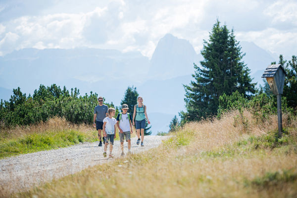 From the car park, trail no. 6 leads over serpentines to the Zanser Alm. Pass the Pension Sass Rigais and follow the path to the bridge over the St. Zenon stream. To the right of this begins the Adolf Munkel trail, marked consecutively with no. 35. The wide path nestles against the gentle ridges, which will catch your eye with mighty stone pines and lush fields of alpine roses. It is worth taking a break now and then to enjoy the overwhelming views of the almost 800-metre-high north faces of Furchetta, Sass Rigais and Fermeda towers. Finally, we reach the Gschnagenhardtalm. After a well-deserved snack with South Tyrolean specialities, we follow trail no. 36 back to the Zanseralm car park.