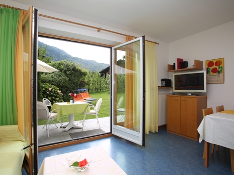 Our cosily and comfortably equipped apartments offer space for 4 to 6 people. All of them offer balcony, bathroom, bed and living room with kitchenette, satellite TV and safe. We even offer bed linen and towels. In front of the house there is a big garden with lawn for sunbathing, kid’s playground, a cosy sitting area under arcades and table tennis.