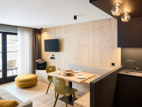 The modern and high-quality furnished apartments of the Movi Family Apart-Hotel****S are located in a sunny and quiet panoramic position. At the same time, the lively centre of Corvara in Alta Badia is very close by. Nestled in the dream landscape of the Dolomites, our apartemnts with perfectly equipped kitchens and free Wi-Fi are the perfect holiday home for a relaxing family holiday in the mountains. We will spoil you with culinary delights at the gourmet breakfast with kids' buffet area and in the lounge bar with drinks and snacks.