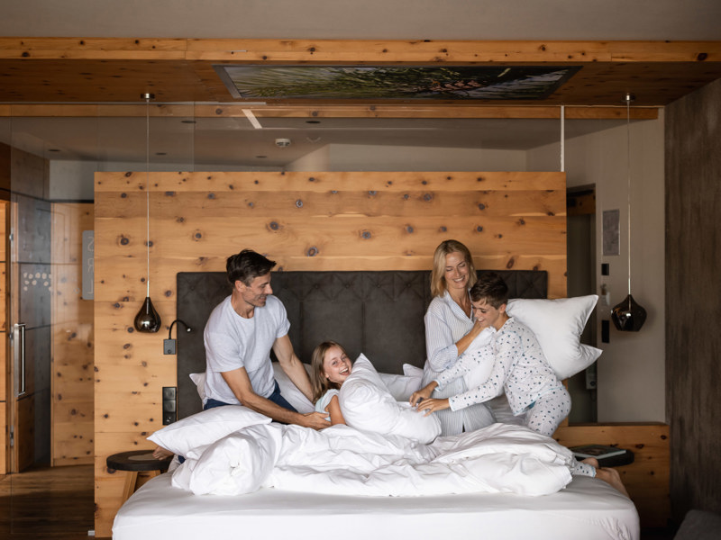 DAS GERSTL Family Retreat has been welcoming guests of all ages since May 2025 as a sustainable holiday home for an eventful and relaxing family holiday in Vinschgau. Lots of wood and light, a spacious terrace and a luxurious bathroom create a cosy ambience in our suites, studios and chalets in a panoramic location. Culinary delights are provided as part of the gourmet board, with GERSTL's gourmet market and other gourmet highlights. On request, we can offer you a family package with pushchair, buggy, baby cot and much more, and we have a free parent-child station with baby food. There is plenty of space to let off steam indoors with a crawling course, supervised climbing wall, indoor football pitch and more. Outside there are pedal go-karts, a playground and an off-road slide waiting for little adventurers.