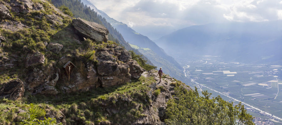 The panoramic tour through the Meran region starts at the Rösslwirt in Rabland. Bikers leave Rabland in the direction of Sonnenberg and turn right shortly before Partschins, pedalling over a difficult trail through a rocky slope and crossing a suspension bridge to Partschins. At the eastern end of the village, cyclists cycle through orchards and up to the Saxner Steig.