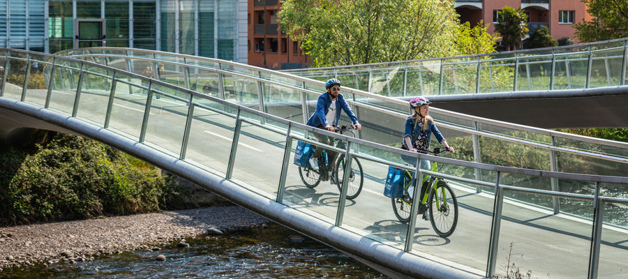 In Bruneck, the Pustertal cycle path leads along Rienz river through the city centre and along historical buildings.