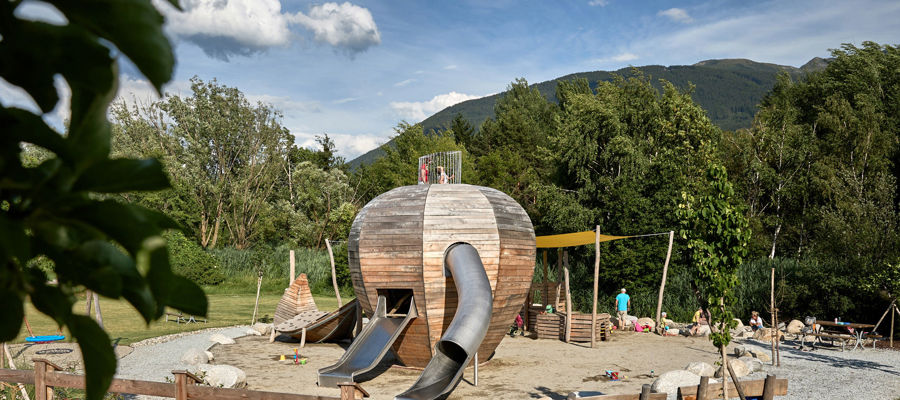 While the children play, their parents can enjoy the sun and the views lying on the wooden sunbeds, with the shape of animals. The circular path connecting the game stations, goes along two cosy huts.