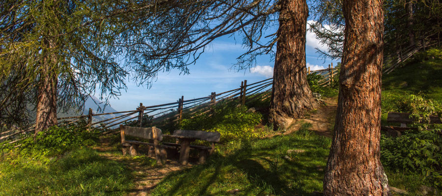 The old and new timber houses are located on the green, partly densely wooded slopes and beyond the more than 3,000 meter high mountains of Ulten jut into the sky as foothills of the Ortler massif.